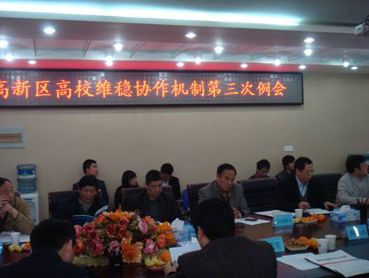 3月30日下午,高新区高校维稳协作机制第三次例会在我校行政楼336举行。副校长汪荣有出席会议并作重要讲话,高新公安分局副局长芦玉林、高新区九所高校的保卫处长及高新刑侦大队、消防大队、出入境大队、网安大队、高新派出所、瑶湖派出所等单位负责人共26余人参加了会议,会议由国保大队队长黄晓刚主持。