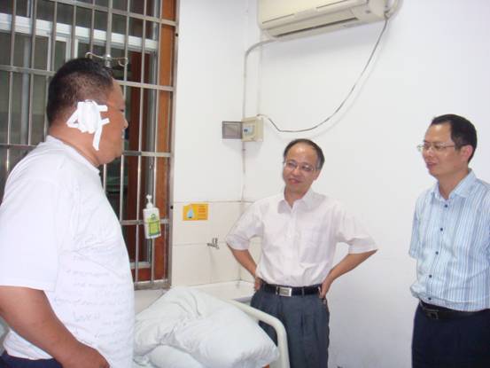6月11日下午,副校长汪荣有代表学校领导来到江西省第二人民医院,看望了在“6.10保安被打事件”中受伤的曹延晖同志。保卫处处长章建明、副处长龚永宏及校卫队负责人袁政勇等陪同慰问。