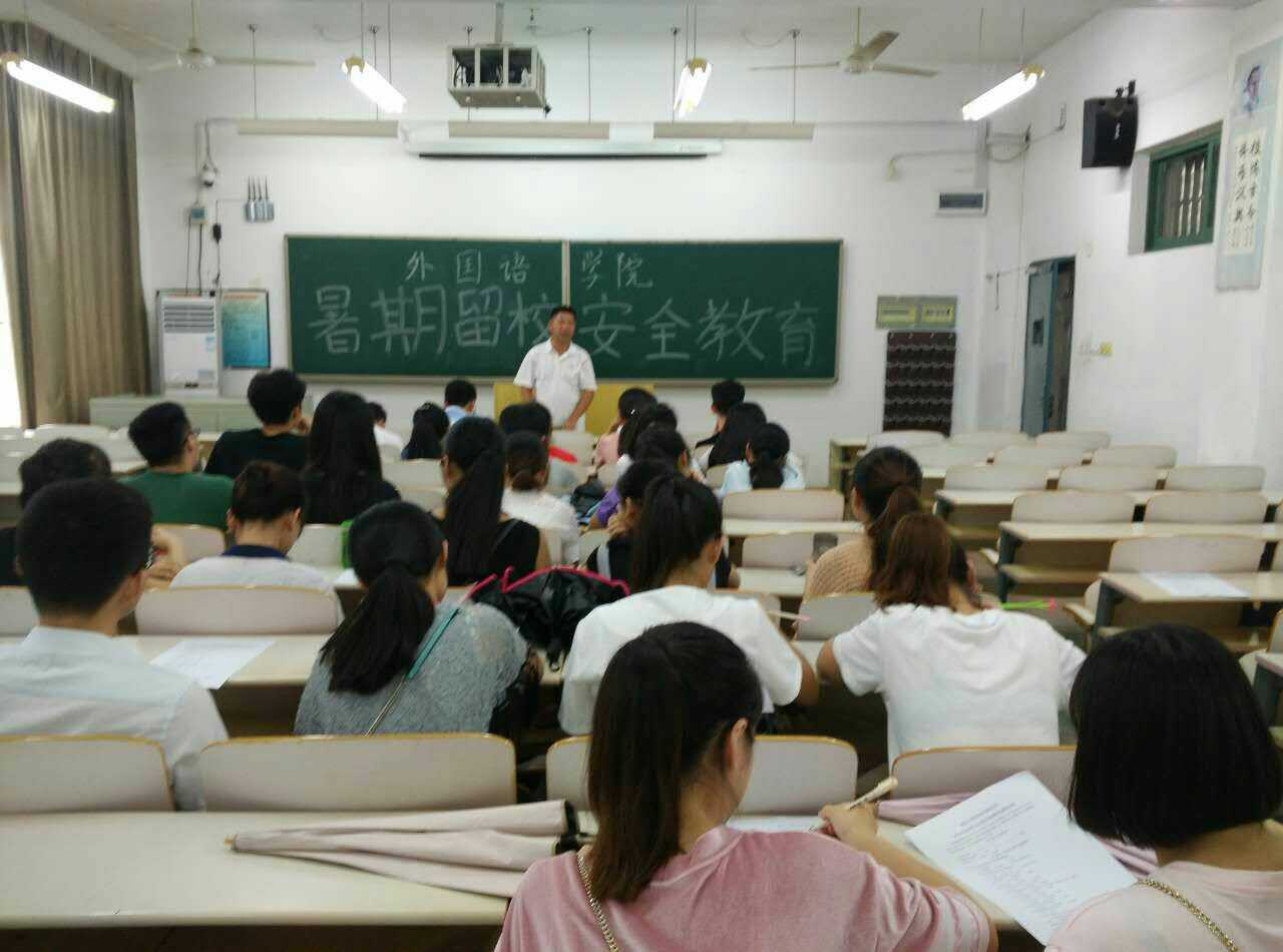 2016年7月12日,外国语学院在南B312教室,召开暑期留校学生安全教育会议。会议由学生工作办公室副主任、分团委副书记王聪主持。学院党总支书记朱代洪做了动员讲话。参与备考硕士研究生、公务员、以及暑期留校勤工俭学的学生参加了会议。