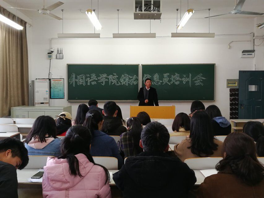 2018年2月26日下午4点半,外国语学院在教学楼南B310召开了综治信息员培训会外国语学院党总支书记朱代洪、党总支副书记杨铖、分团委副书记王聪、辅导员蔡杨以及非毕业班各班班长和团支书参与本次培训会。