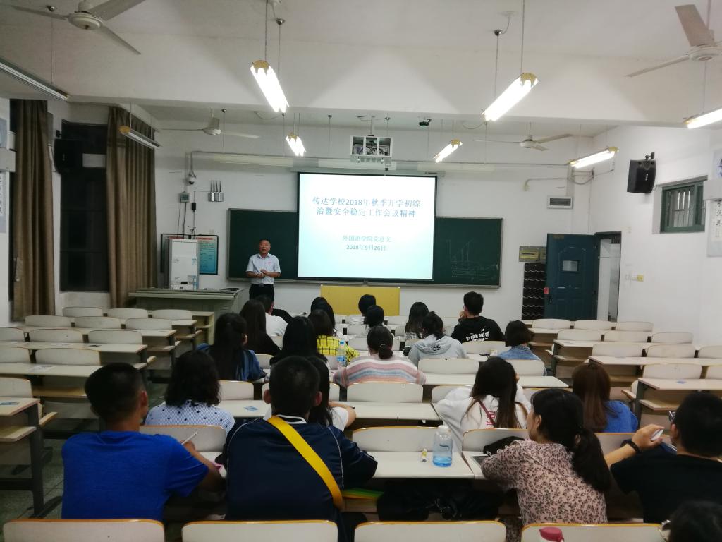 为进一步加强队伍建设,更好地服务学生,促进我院综治工作顺利开展,9月26日,外国语学院在教学南大楼B312召开了各班级综治信息员培训会,传达了学校2018年秋季综治安全工作精神,并对各班级综治信息员进行了培训。外国语学院党总支书记朱代洪,我院学生工作人员及各班级全体综治信息员参加会议。