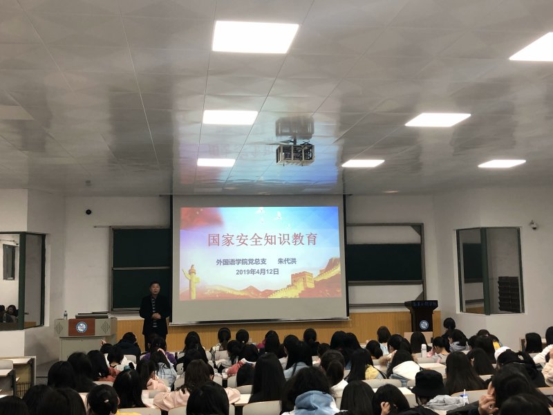 在第四个全民国家安全教育日到来之际,为帮助大学生更加切实了解国家安全观的内涵,明确了国家安全的重要意义,激励学生要有“国家利益,高于一切、国家安全,人人有责”的责任意识和国民担当。外国语学院于2019年4月12日晚上7点在南C205开展了国家安全知识教育讲座。外国语学院党总支书记朱代洪担任此次讲座的主讲,全院各班级代表和班级综治信息员共计300人参加了此次讲座。