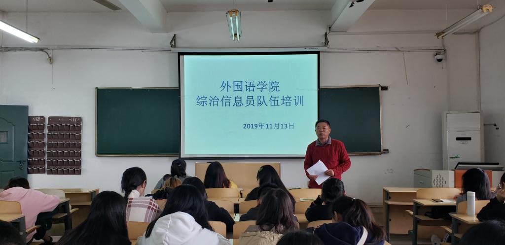 为了加强综治信息员工作能力,外国语学院于2019年11月13日在南B315召开综治信息员队伍培训会议。外国语学院党总支书记朱代洪、学院学工办主任王聪出席本次会议,各班级综治信息员参与本次会议。