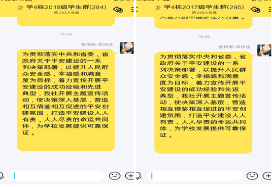 据悉,为努力在平安建设宣传的广度、深度和效果上取得新突破,学生社区采取线上线下结合的方式,多项式的组织了15个公寓开展学习关于党的十九大和十九届二中、三中、四中、五中全会精神,坚定方针政策;学习习近平总书记关于平安中国建设的重要指示,高举领袖号召;学习抗击新冠肺炎的有关法律法规和规定、抗疫斗争中涌现的先进人物及先进事迹,发挥榜样力量。