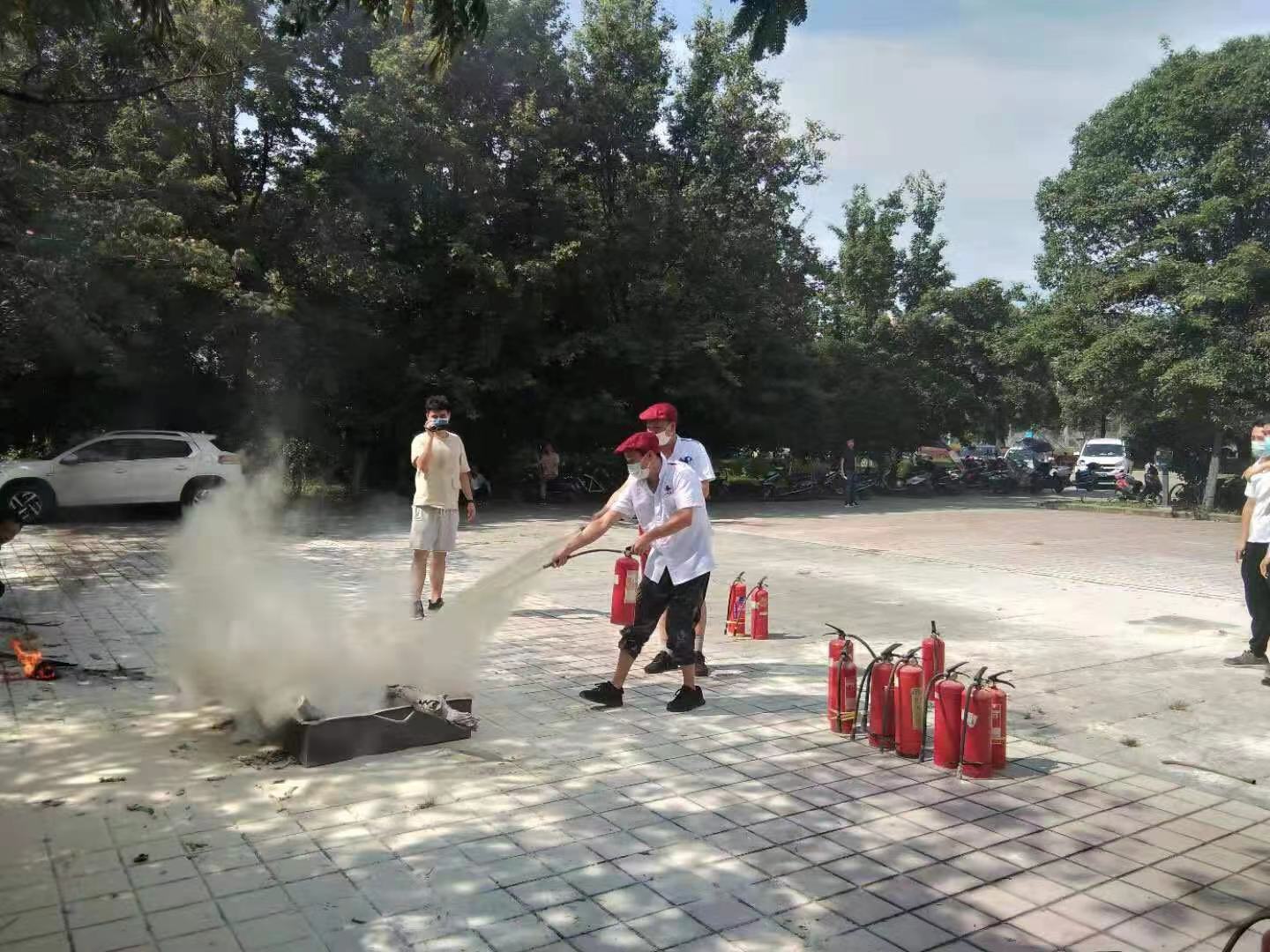 在培训考核现场,消防重点单位工作人员、志愿消防队员、微型消防站队员、消防控制室操作员、实验室工作人员、保安员、食堂从业人员等工作人员通过实践操作使用灭火器灭真火和消防栓出真水实操实训,基本达到了“见火不慌、抬手就打”的效果。通过这次培训考核,提升了消防重点单位扑灭初起火灾的能力,进一步夯实了学校消防安全基础。