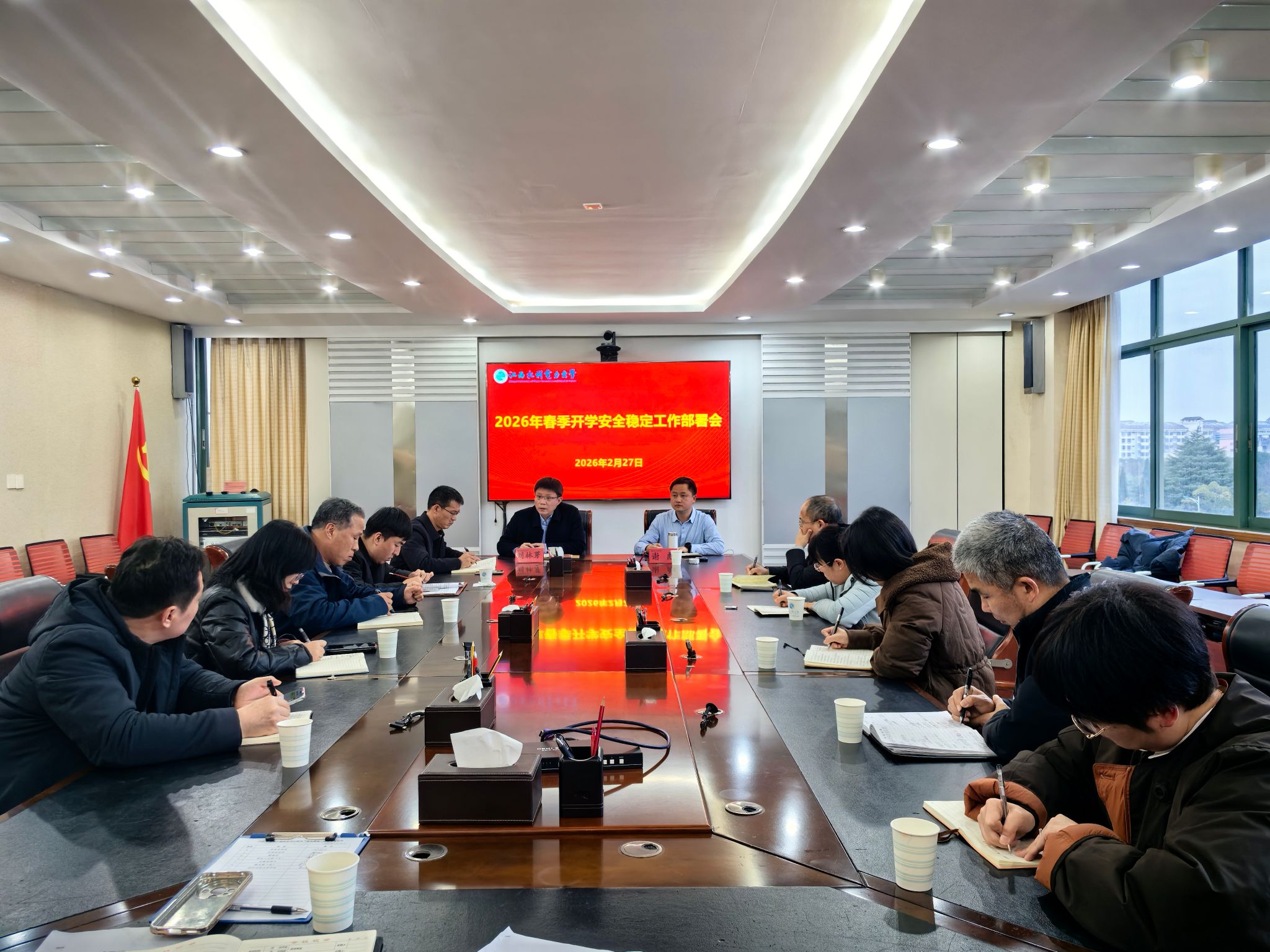 为全面落实上级关于校园安全工作的部署要求,压实安全责任,细化防控举措,确保新学期开学平稳有序、校园安全稳定,2月28日下午,我校在行政楼336会议室召开2026年春季开学安全工作部署会。校长刘林芽、副校长谢彪、相关职能部门负责人、保卫处相关工作人员参加会议。